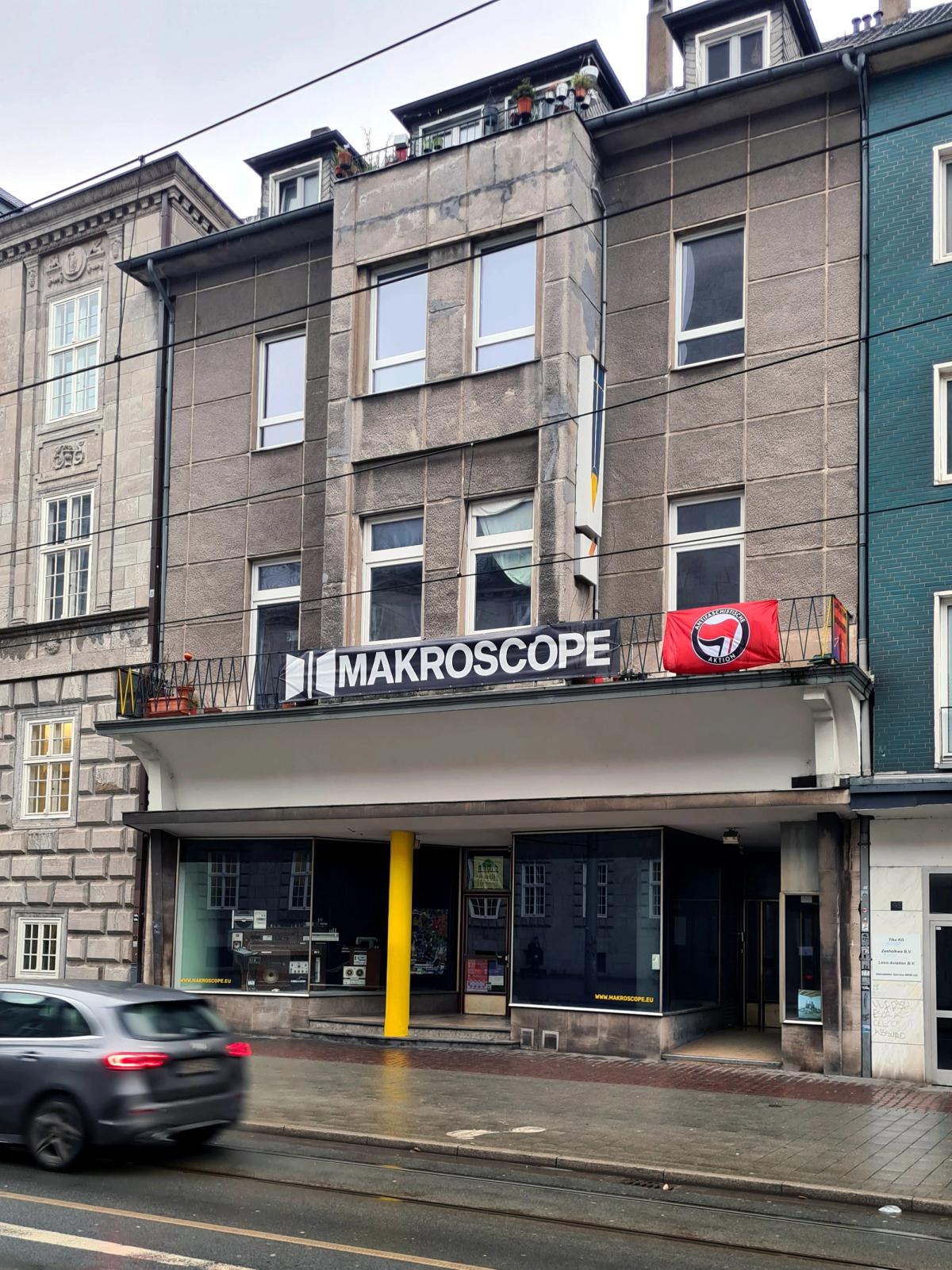 Als friedliches Zeichen gegen diesen Aufmarsch hatten einzelne Nutzer*innen des Makroscope am vergangenen Montag die Fahne der Antifaschistischen Aktion an einem der Balkone befestigt. Dies versucht die AfD in ihrer Pressemitteilung in aggressivem Tonfall zu skandalisieren. Die Rede ist von einer “linksterroristischen” Organisation und das Makroscope mit seinem Museum und den Ateliers wird gar zum “Hort linksextremer Ideologie” stilisiert. Hier hätten wir uns durchaus eine journalistische Einordnung gewünscht. Selbstverständlich ist die Antifa-Bewegung nicht terroristisch. Ihre Wurzeln reichen bis in die Weimarer Republik, als sich unter diesem Namen Mitglieder von SPD und KPD gegen den Aufstieg der NSDAP zusammenschlossen. Sie fand ihre Fortsetzung in der Bundesrepublik – aus gegebenem Anlass.