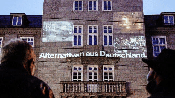Die Künstler*innengruppe DfA (Deutschland für Alle) projizierte, parallel zur konstituierenden Ratssitzung der Stadt Mülheim, “Bilder deutscher Kontinuitäten” aus einer in unserem Haus gelegenen Wohnung, an die Fassade des gegenüberliegenden Rathauses. Die Gruppe forderte damit die Parteien des Rats dazu auf, nicht mit der AfD-Fraktion zu kooperieren. Der Ringlokschuppen hatte der Gruppe die Nutzung seiner Künstler*innenwohnung für die Aktion gestattet. Projiziert wurden unter anderem Originalaufnahmen aus dem nationalsozialistischen Mülheim und des Pogroms in Rostock-Lichtenhagen. Dazu war der Satz “Alternativen aus Deutschland” zu sehen. Zur inhaltlichen Einordnung und Vermittlung der Aktion verteilten die Mitglieder der Gruppe Flyer an Passant*innen und hatten Plakate in den Schaufenstern des Makroscopes angebracht – Titel: “Nie wieder Faschismus, nie wieder Krieg”.