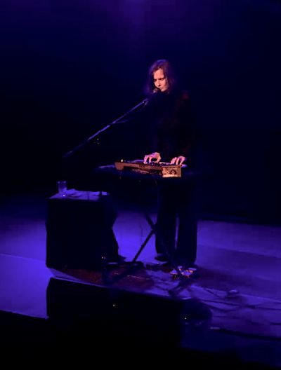 Solo-Musiker*in mit Synthesizer, Gesangskunst und Fieldrecordings von Kassette.