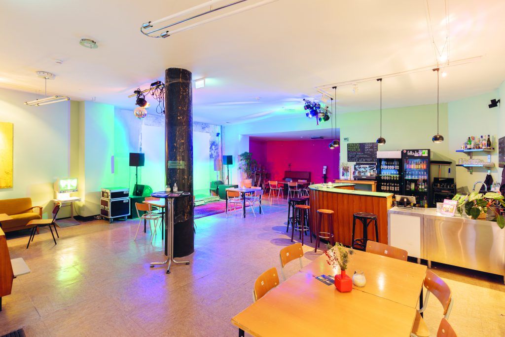 Hier findet der Großteil unseres kulturellen Programms statt - Konzerte, Vorträge, Performances, wechselnde Ausstellungen. 100m². Bestuhlung für 70 Personen möglich, Präsentationstechnik und Bar vorhanden.