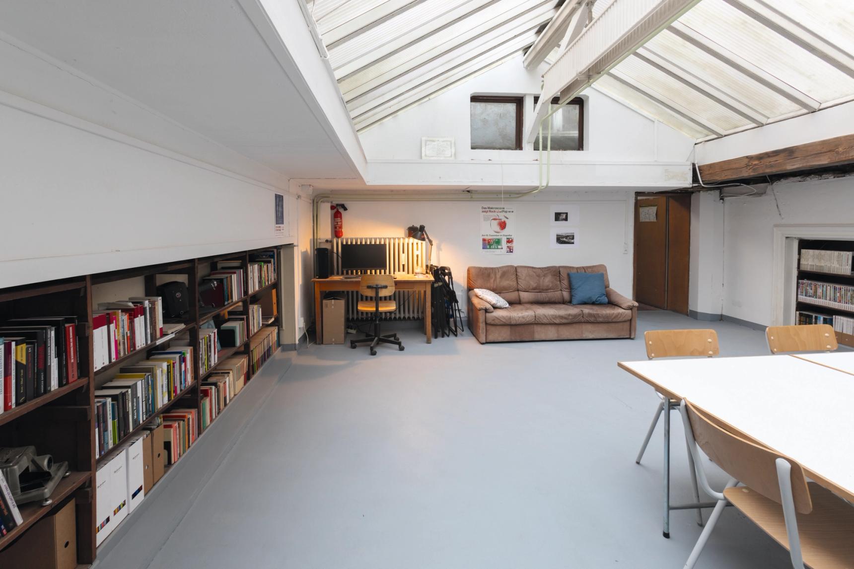 Ein Arbeits- und Seminarraum. Unsere kleine Bücherrei enthält Kunstbücher sowie Sachbücher zu kultur- und gesellschaftspolitischen Themen. Die Zeitschriften Kunstforum International sowie Texte zur Kunst haben wir im Abo. Nutzung auf Anfrage.